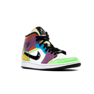 נייק איר ג'ורדן 1 מולטי פטנט בגובה מיד בשילוב צבעים צבעוני עם שחור מבריק. לנשים וגברים