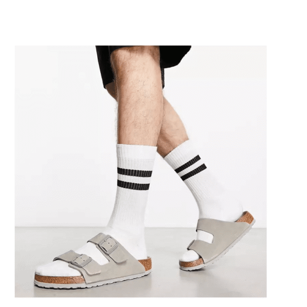 נעלי בירקנשטוק אריזונה בצבע שחור עם סוליית השעם המפורסמת של מותג בירקנשטוק.