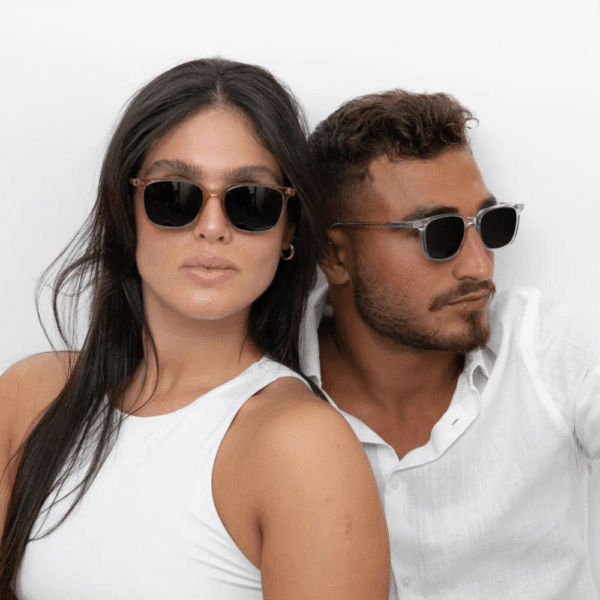 מסגרת אצטט שקופה בצבע באז' שיוצרה בעבודת יד עם עדשות פולורואיד ירוקות.